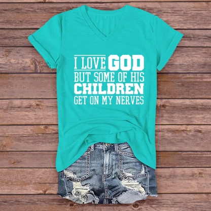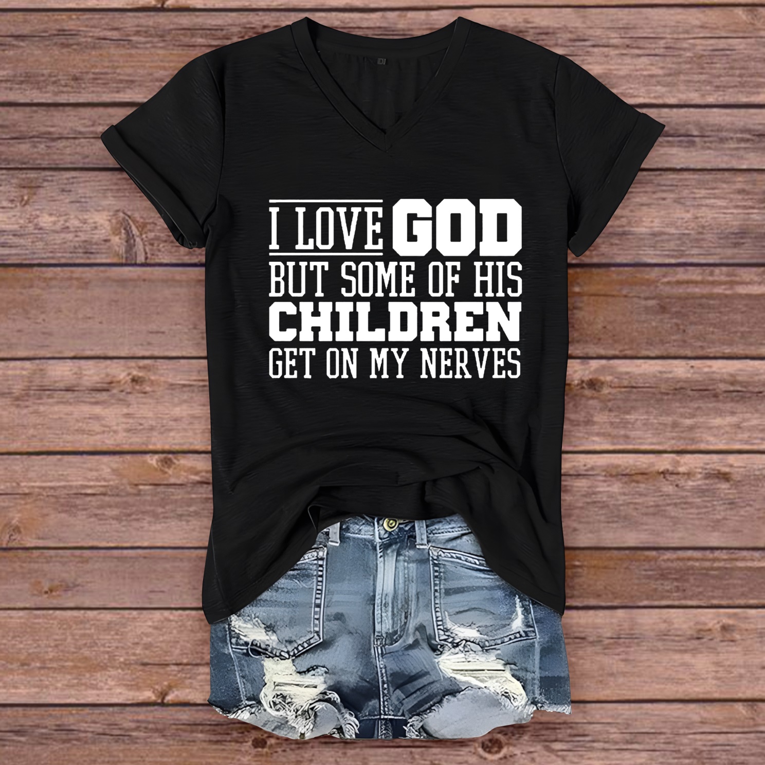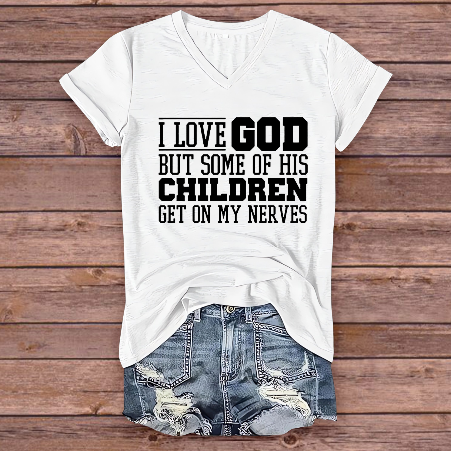 Women's L Love God But Some Of His Children Get On My Nerves Pattern V-Neck T-Shirt