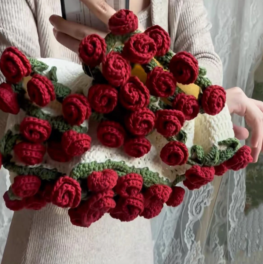 Crochet Rose And Green Leaves Bouquet, 2025 Mother's Day, Easter, Gift For Mom